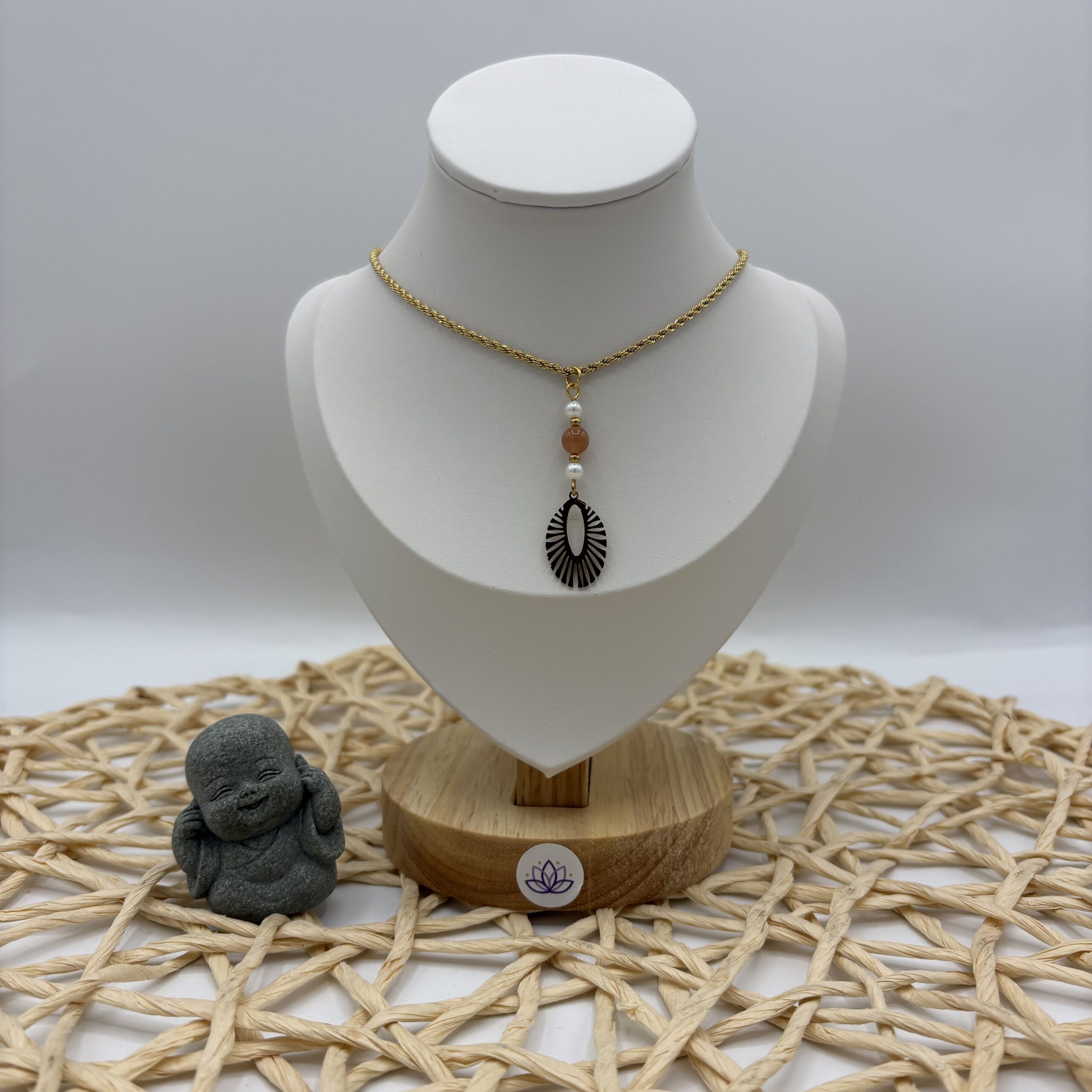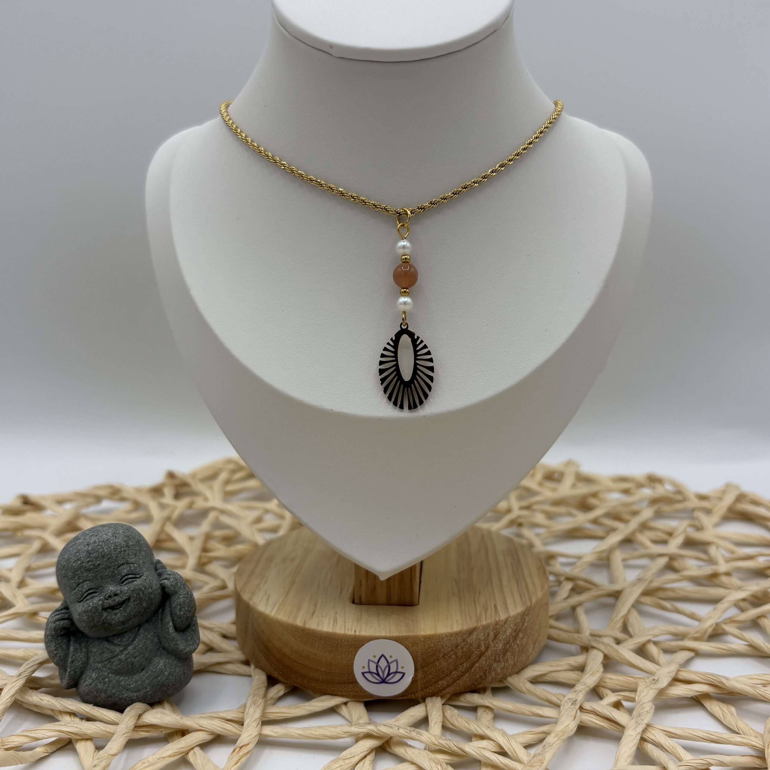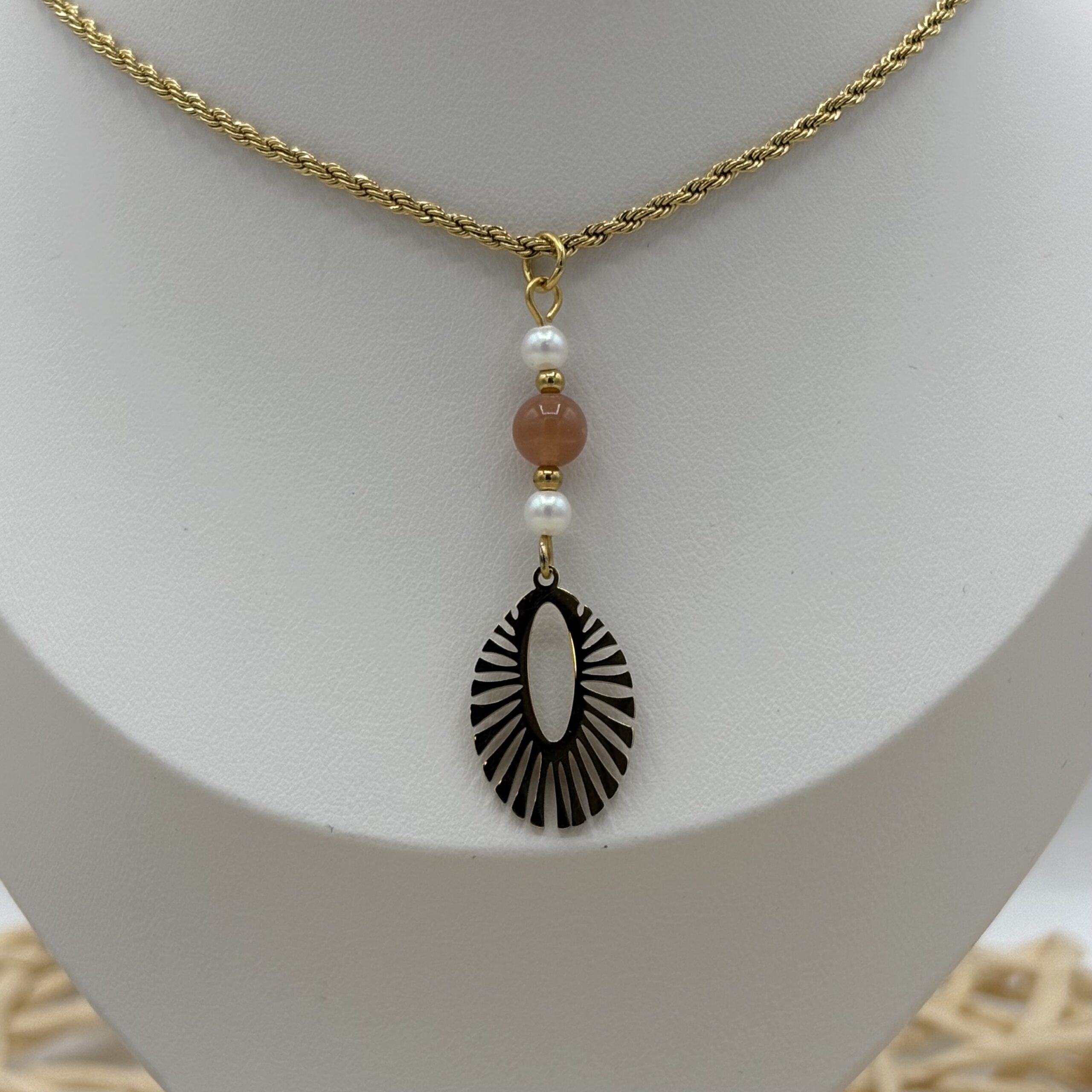 Elégant collier doré en acier inoxydable orné de perles en pierres de soleil naturelles et d’un pendentif oval ajouré